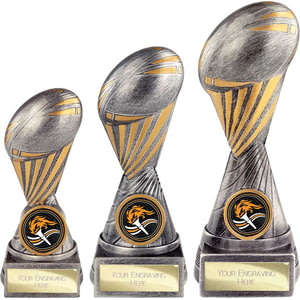 This is a striking trophy, featuring a detailed rugby ball emblem and star motifs, presented on a classic gold and silver stem with a dedicated plaque for personalised engraving.