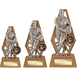This is a trophy featuring a silver-coloured male athlete in mid-action, holding a rugby ball.