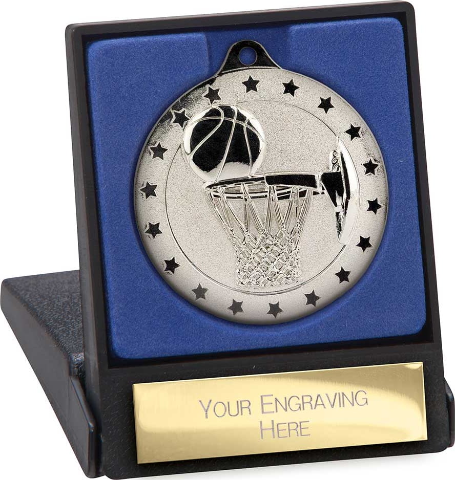 Celebrate sporting excellence with this stunning silver basketball medal, presented in a smart black display case with a personalised engraving plate.