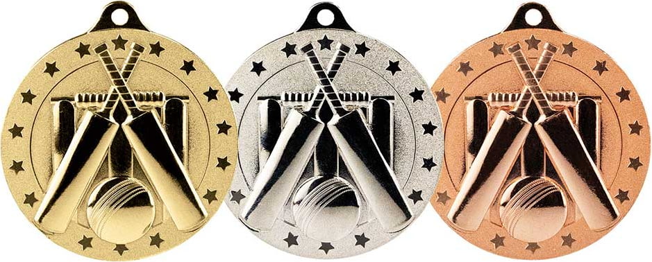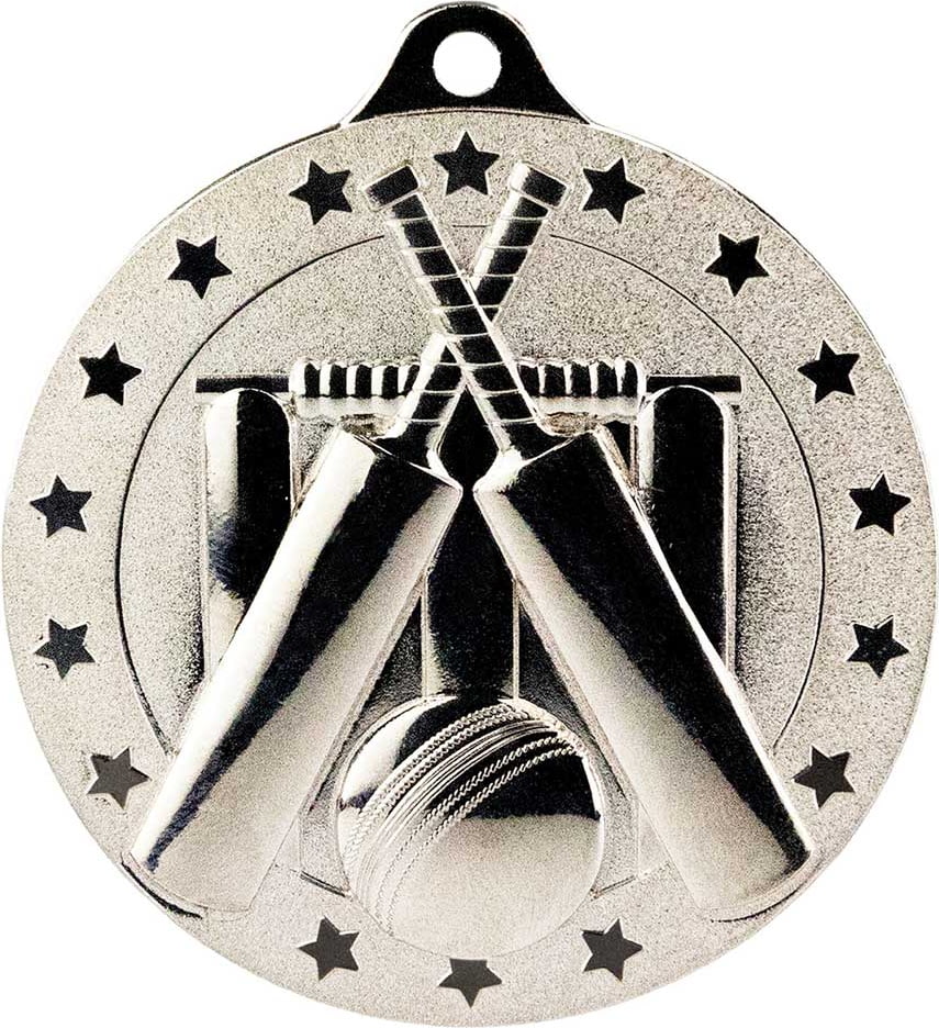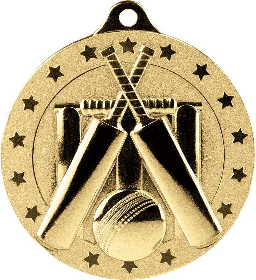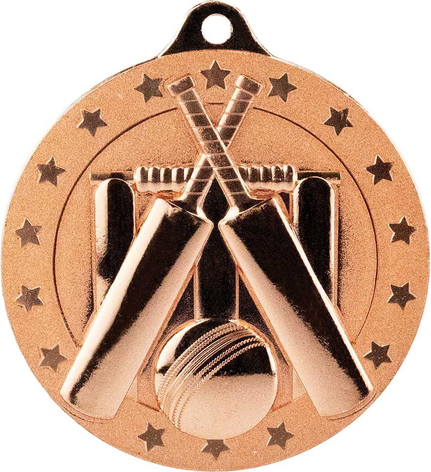 This medal features a classic cricket motif, with crossed bats, stumps, and a ball, all encircled by a border of stars.