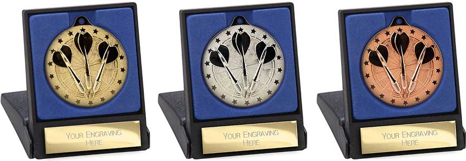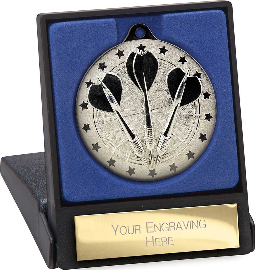This is a handsome silver dart medal, presented in a stylish blue-lined black case with a brass-effect engraving plate.