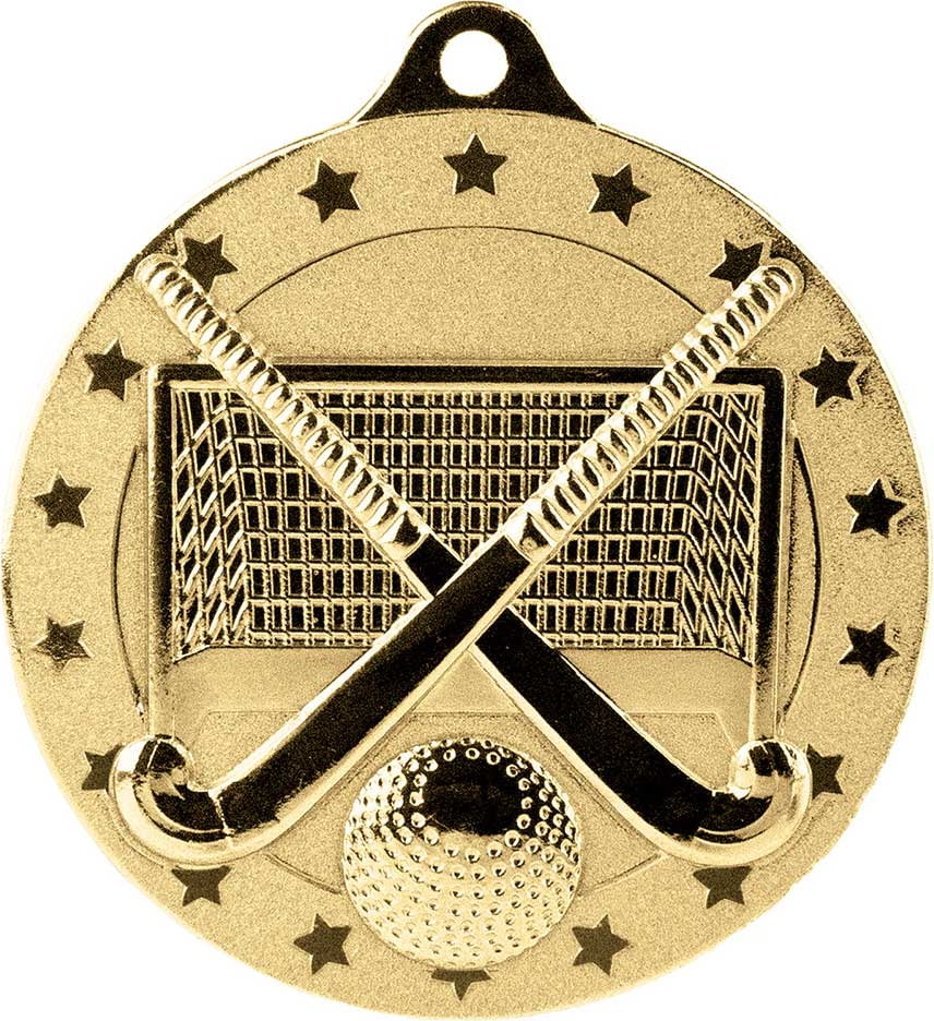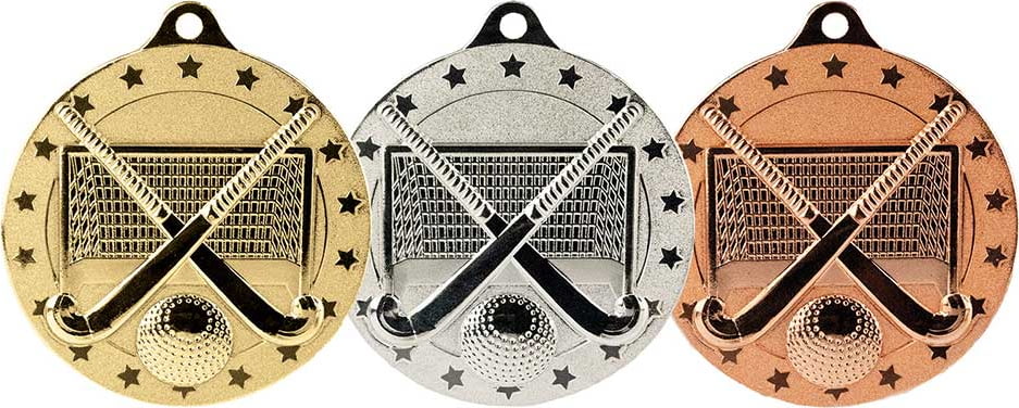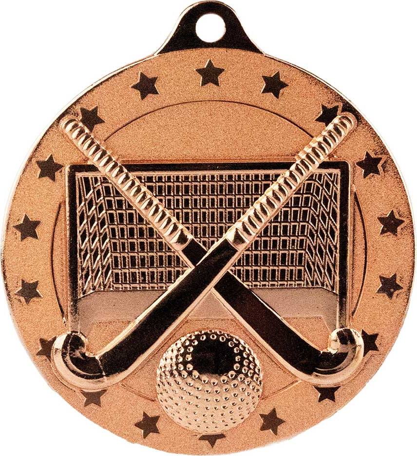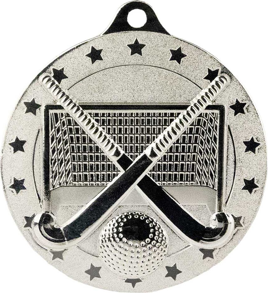This is a hockey medal featuring crossed hockey sticks, a ball, and a goal net, all surrounded by a border of stars.