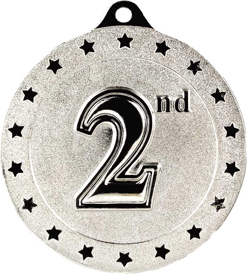 This is a silver-coloured medal, perfect for celebrating second place achievements, featuring a prominent '2nd' inscription and a border of decorative stars.