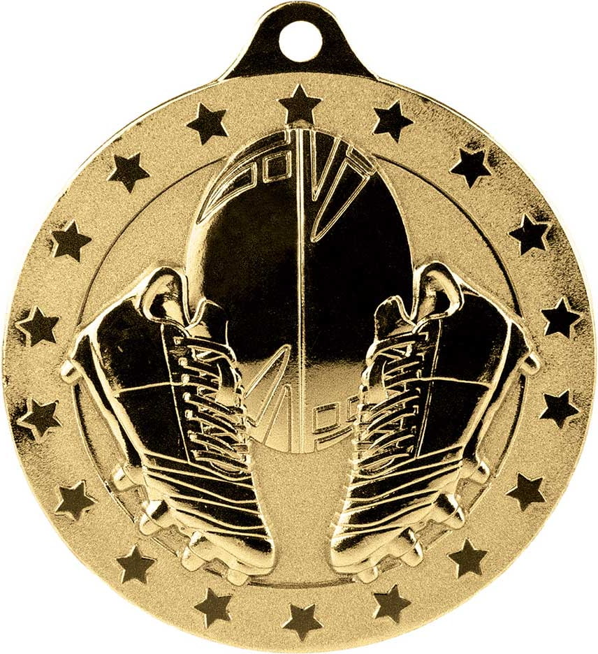 This exquisite medal features a detailed embossed design of a football and a pair of football boots, encircled by a charming pattern of stars.