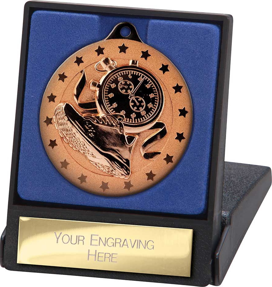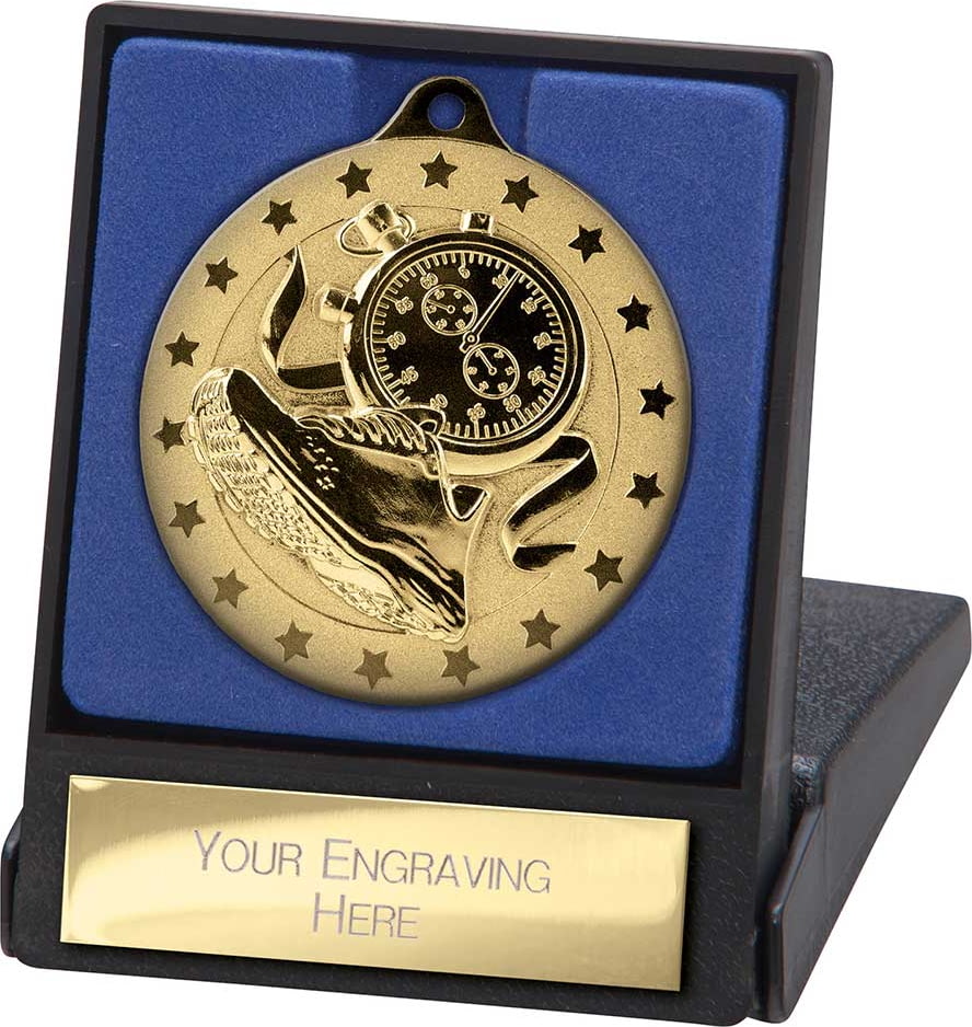 This is a commemorative medal presented in a smart black case with a blue velvet insert, perfect for acknowledging athletic achievement and featuring a space for personalised engraving.