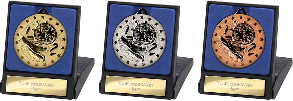 This is a medal featuring a running shoe and a stopwatch, perfect for celebrating athletic achievements and honouring those who excel in their pursuits.