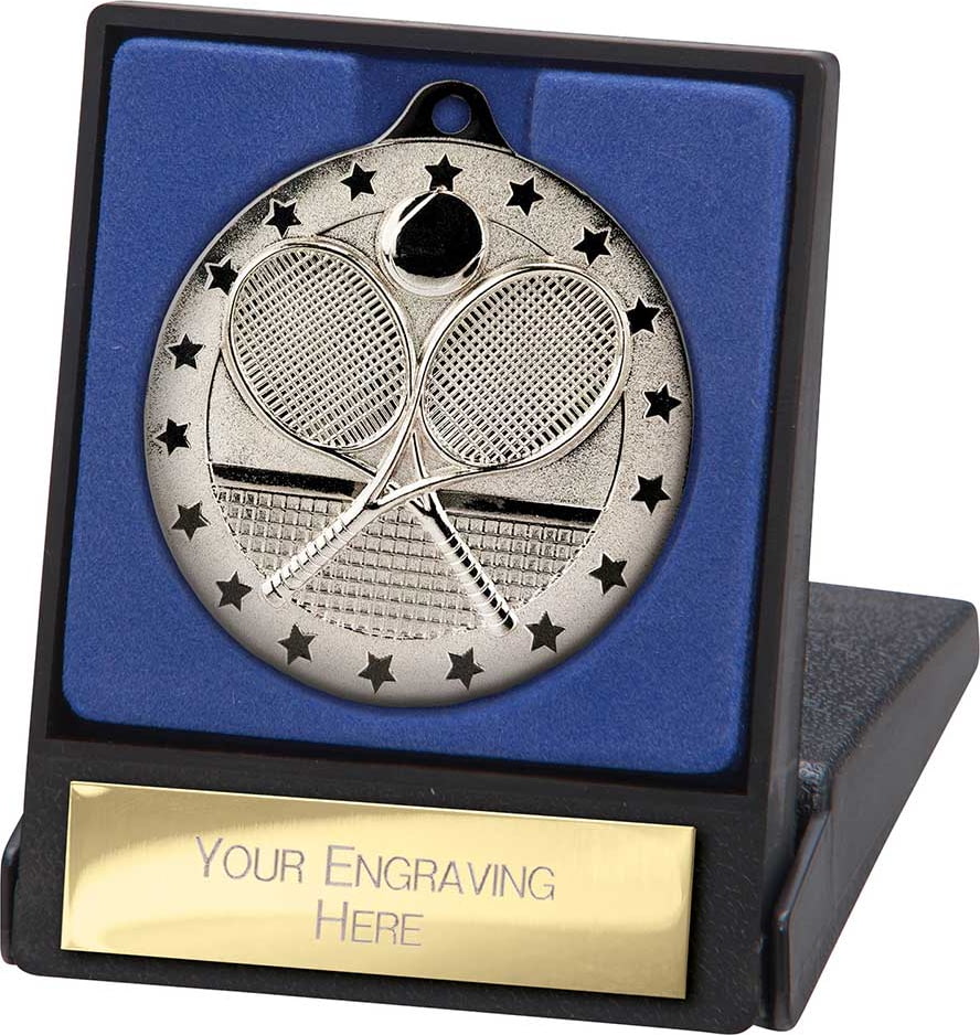 This is a silver-coloured tennis medal, presented in a black display box with a royal blue velvet-style insert, ready for personalised engraving.