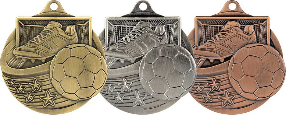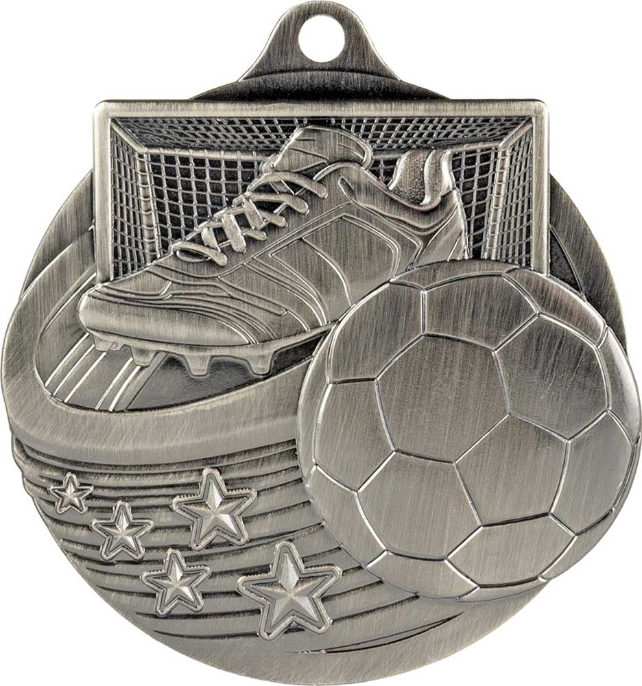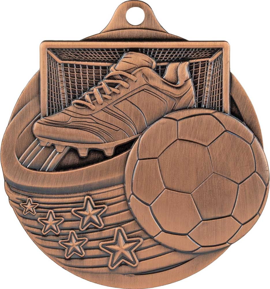 This is a football-themed medal, embossed with a soccer ball and boot in front of a goal net, celebrating the values of the game.